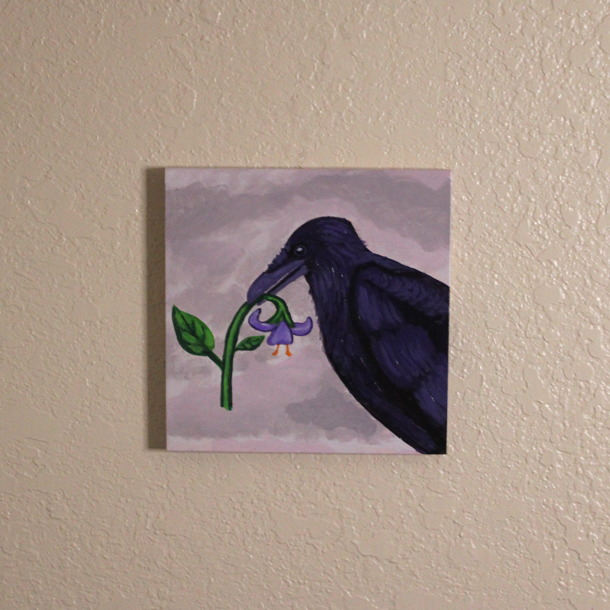 A painting of a crow holding a purple flower.